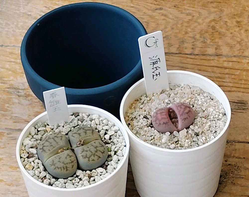 Gemmafoliaさんのリトープス春雛玉(曲玉系)と源氏玉、そしてリメ鉢