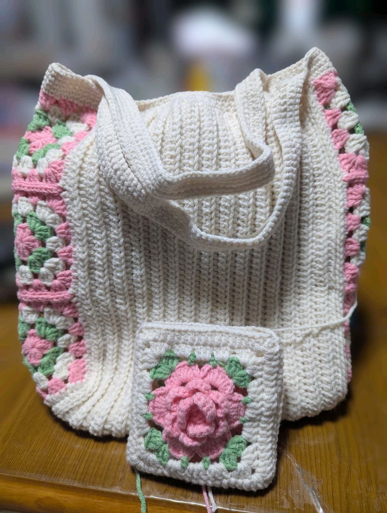 ④編み始めていた毛糸のちょっとそこまでバッグ完成しました😊