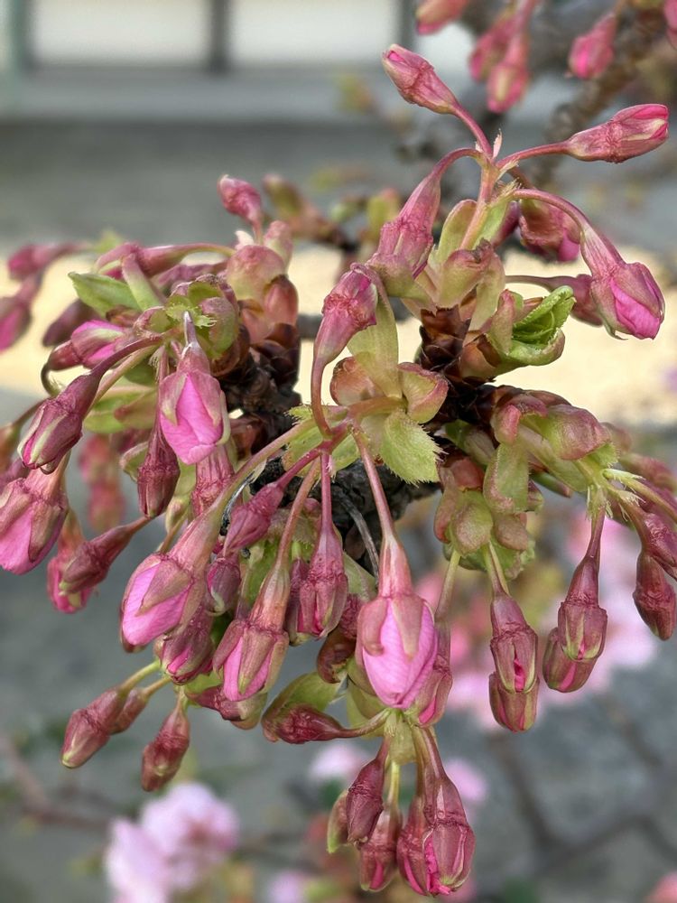 昨年春にご近所さんから頂いた桜の鉢植え。キレイに設えてあるステキな鉢です 初めての冬越しにドキドキ。 (サトザクラと聞いていましたが、河津桜のようです🌸)