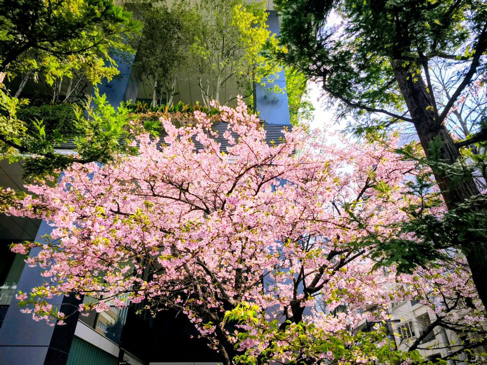 銀座一丁目駅近くのオフィスビルの植栽の河津桜🌸が満開でした✨