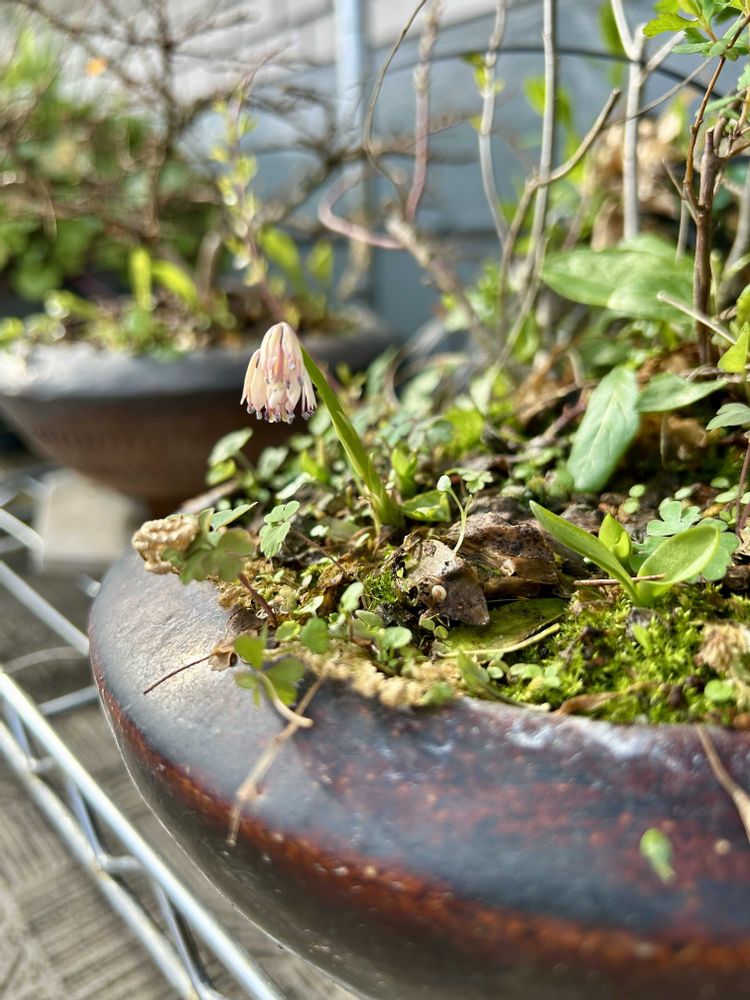 ①昨春、小庭の寄せ植え鉢にひょっこり咲いたヤクシマショウジョウバカマ。葉もなくて消えてしまったかも😢(2025年03月31日)