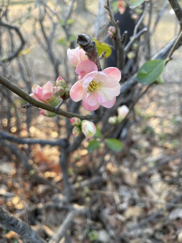 雑木林に囲まれた公園の植え込みに、淡いピンク色の木瓜が咲いてました。