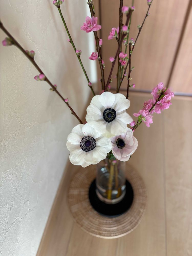桃の花とアネモネを生けました!