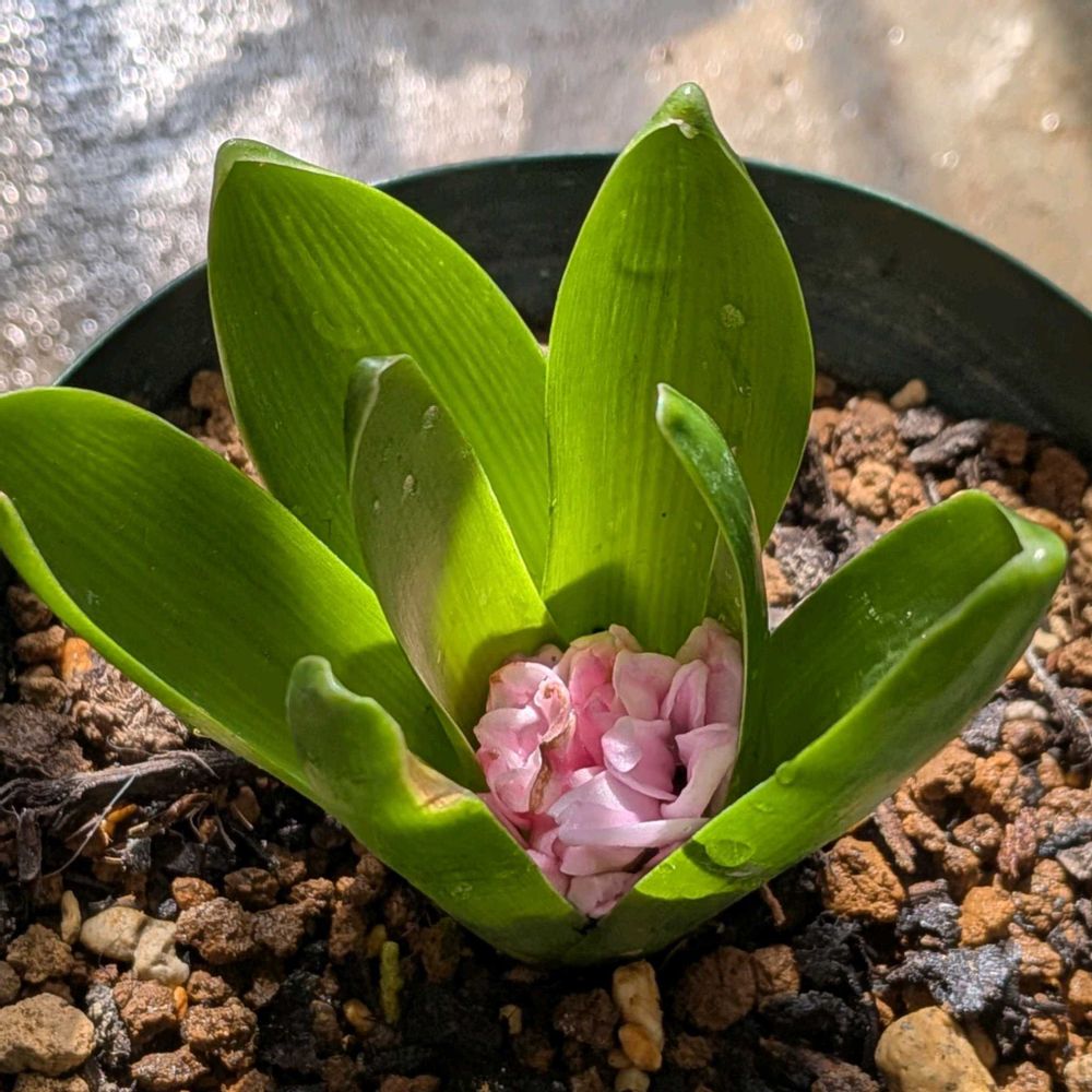 水栽培で満開になり、花を切り1/16に土に植えた球根にまた花が咲きました❣️