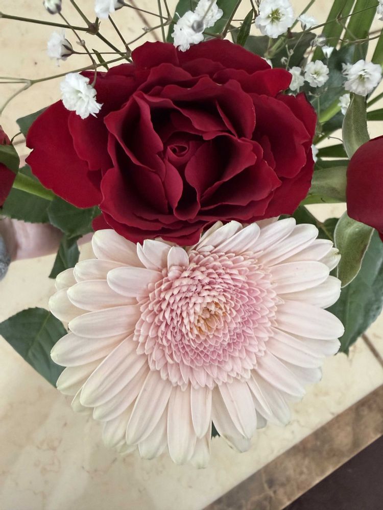 今日は切り花、また名前の分からない赤薔薇です😅ガーベラは長持ちしてます🌸