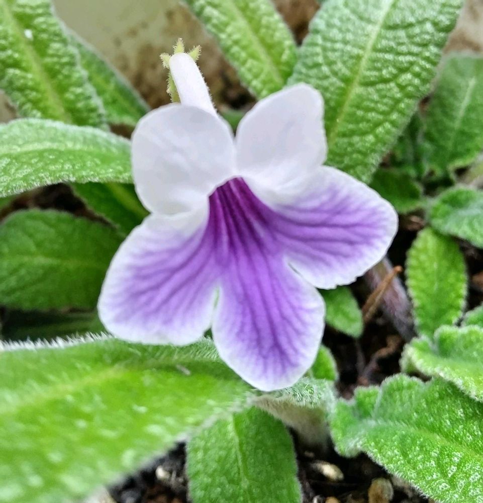 挿し芽の子 ストレプトカーパスが1個咲きました💜🤍🍀