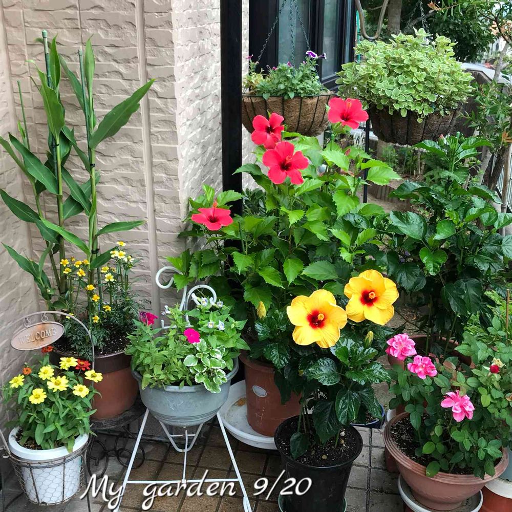 ビタミンカラーのハイビスカスかわ二つと赤いハイビスカスが四つ同時に咲きました❤️💛