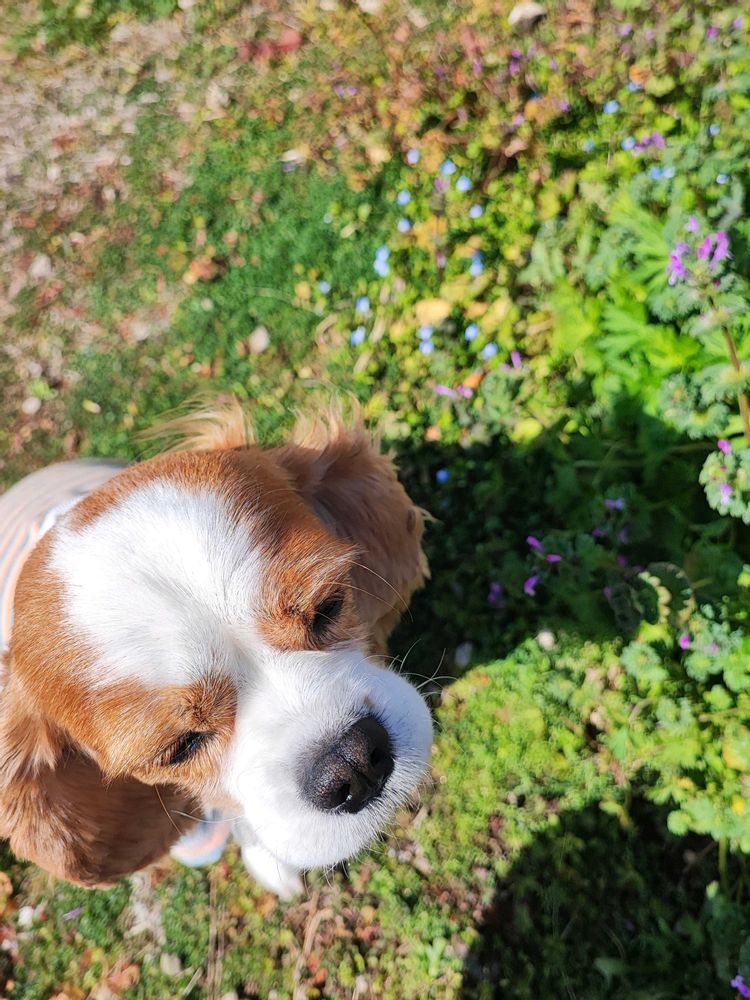 オオイヌノフグリ&ホトケノザの春の雑草最高タッグが庭の外の空き地に。オオイヌノフグリだよ!ってモモ(犬)を呼んできましたが、全く興味なかったみたいですw