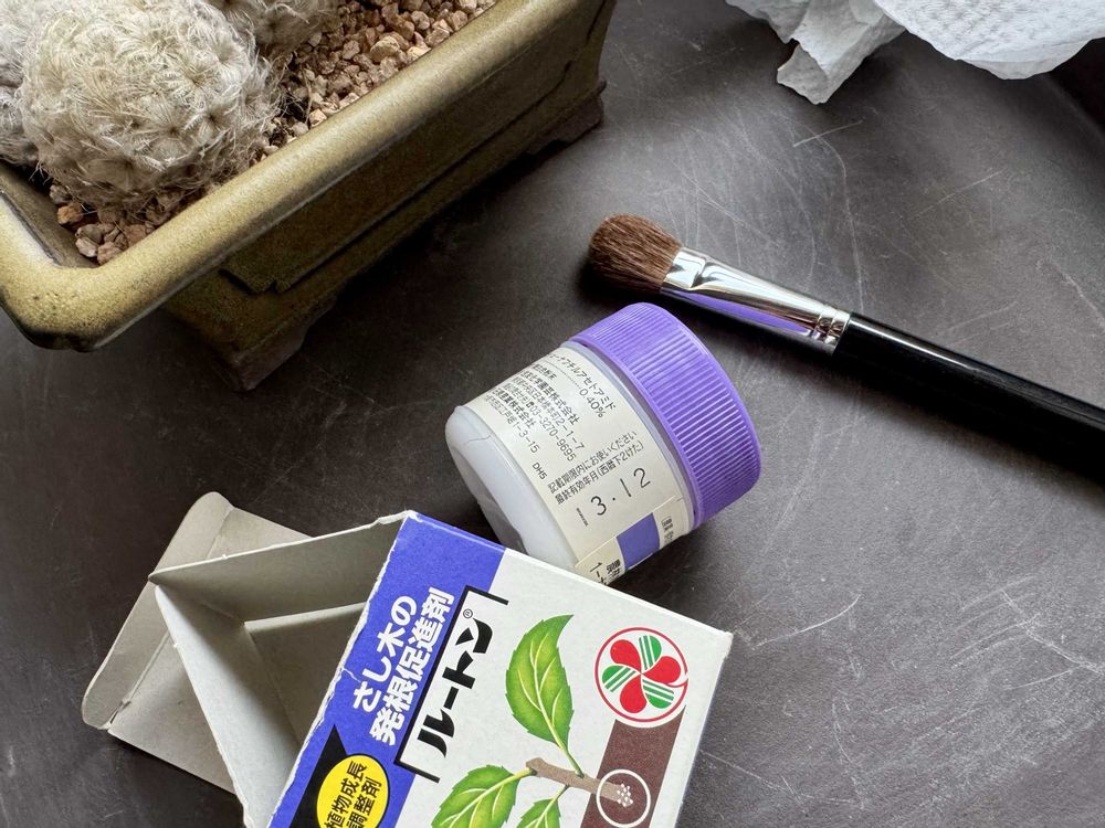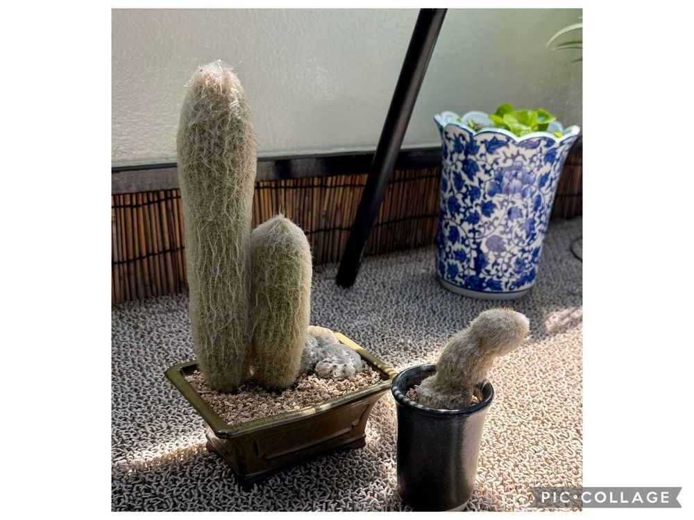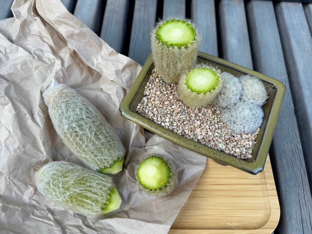 汗ばむほどのお天気の中、徒長していた白サボたちを切り刻み