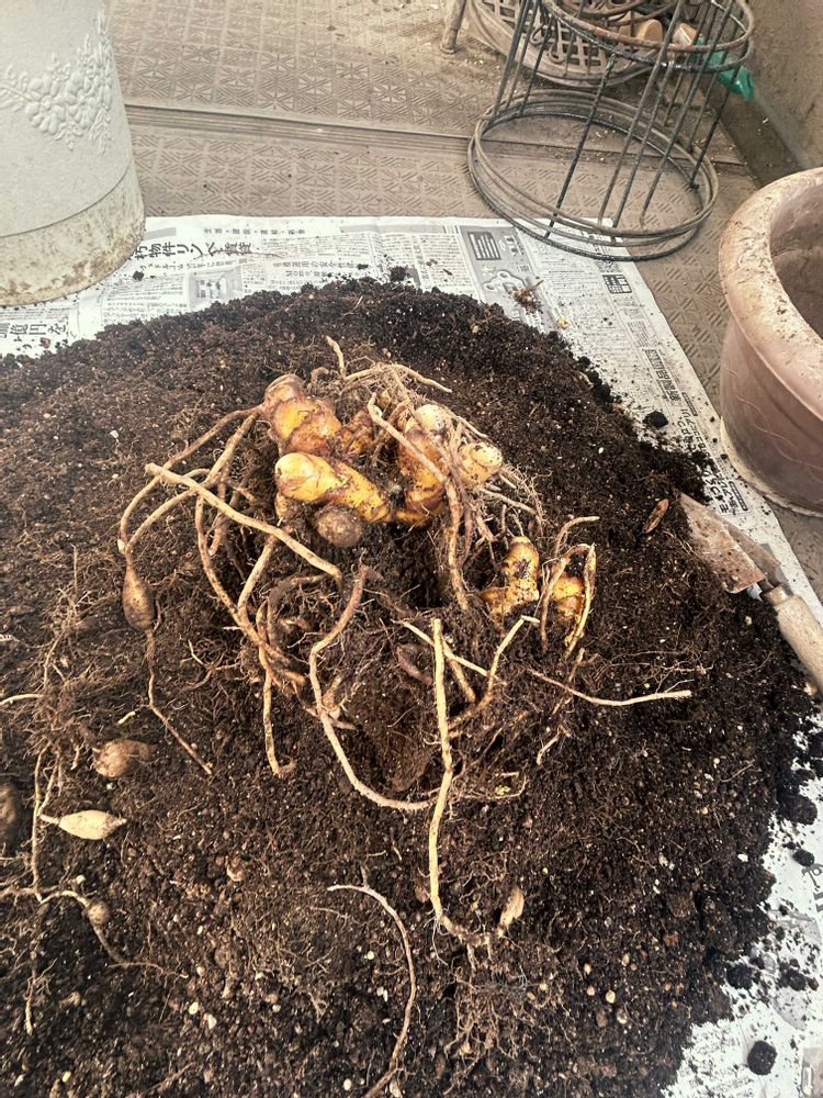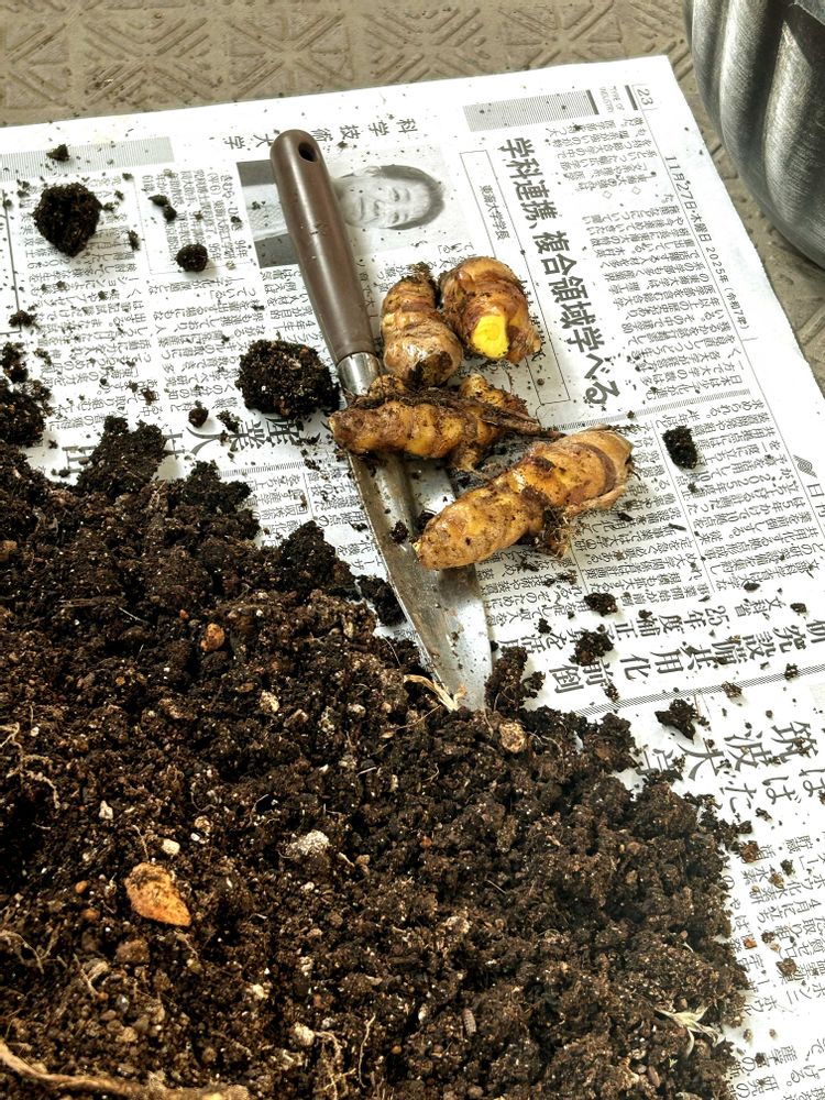ウコンの鉢替え。数本の根っこを拝借してターメリックライスを作りました。