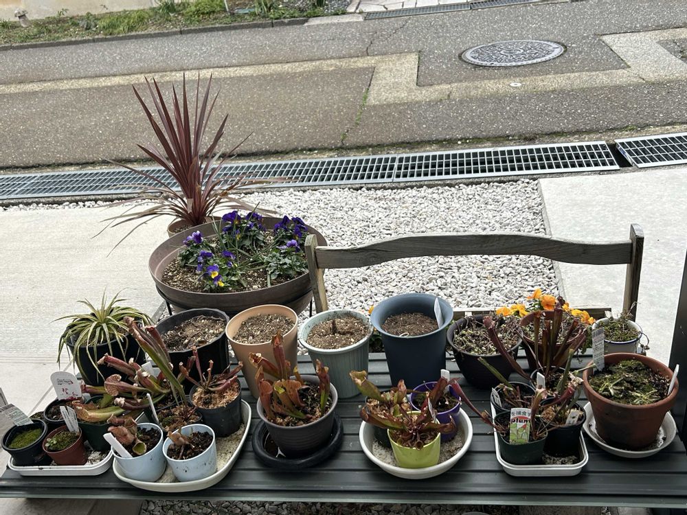 連休2日目で、植替えした食虫植物たちとカーポート下の大きいのを2つ玄関先に並べてみました(´◡`๑)