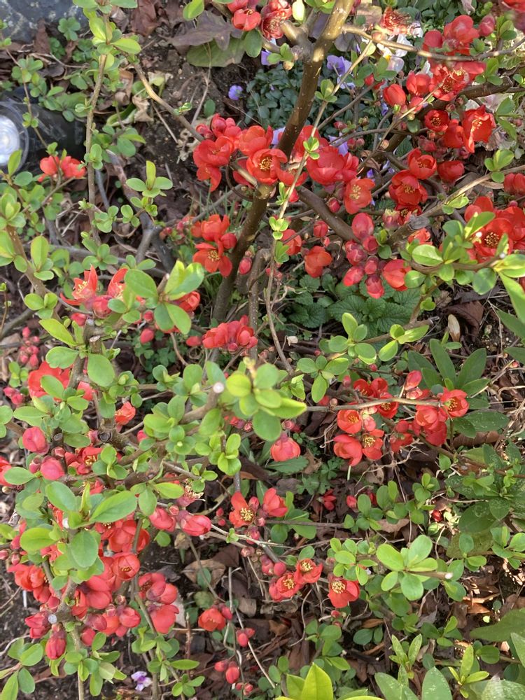 朱赤のボケの花も咲きほこり、、♪