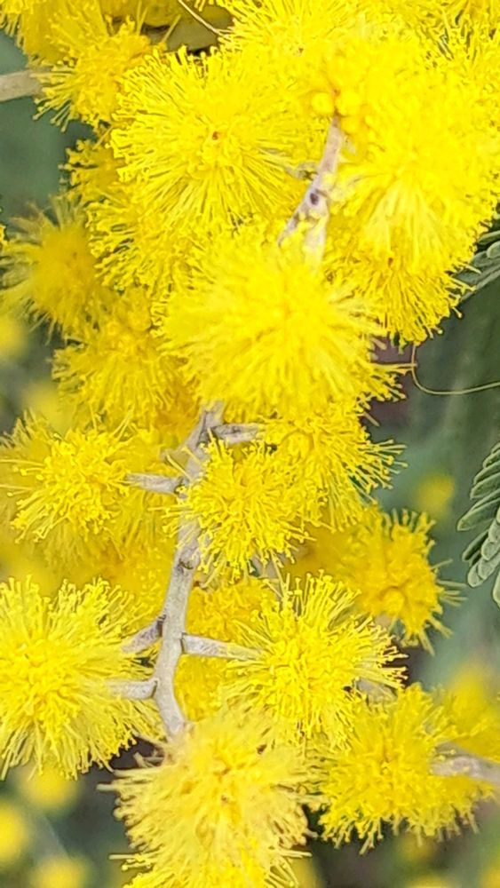 シルバーグリーンで羽のような葉のミモザに鮮やかな黄色のポンポン状の花が開花