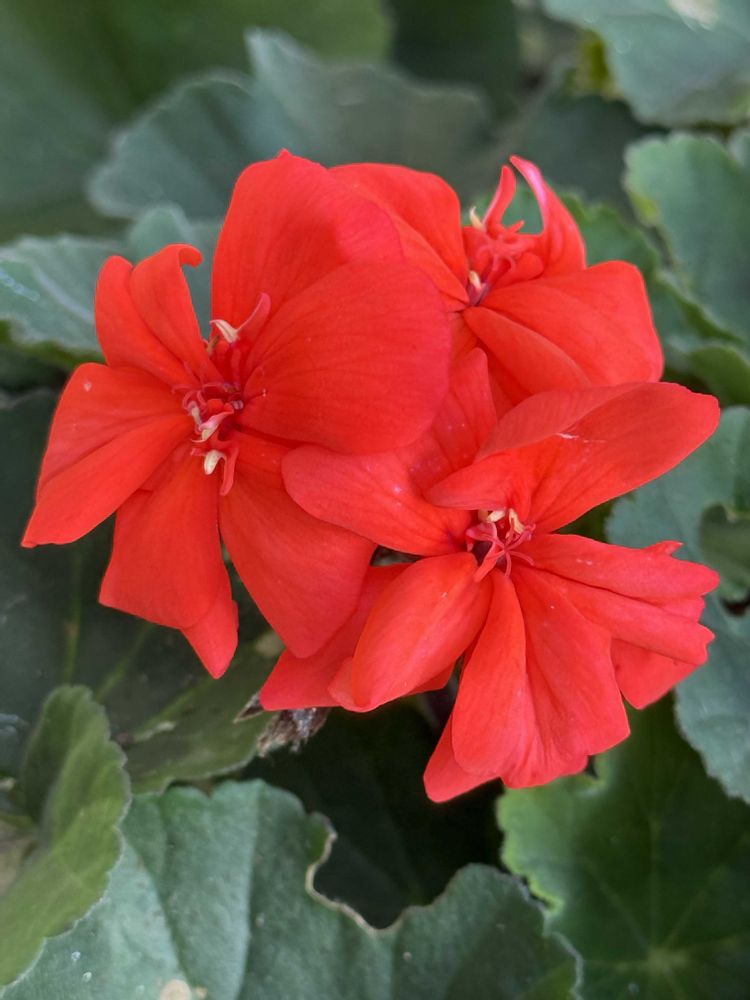 Pelargonium hortorum/Perargonium. Geraniaceae. Geraniales. Magnoliopsida. Tracheophyta Commonly called/Zonal geraniums Native to/Southern Africa;Cape region Symbolism/Fliendship. Cheerful emotions *Genus of about 230 species of mainly evergreen perennials *Erect stems bear 5-petaled flowers *Leaves are variable, are alternate, palmartely lobed, aromatic, often on long stalks. *Most Pelargonium species are native to Southern Africa and were bought to European botanical garden in the 16th and 17th centuries. *The term ‘hortorum’ is genitive plural of the Latin ‘hortus’ means “garden”. Photographed 2/22 10:27am 2026 Posted 2/23(Monday) 12:24pm 2026