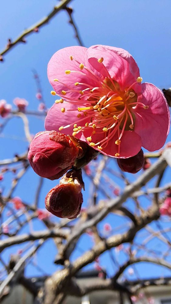 庭の枝垂れ梅が咲き始めました