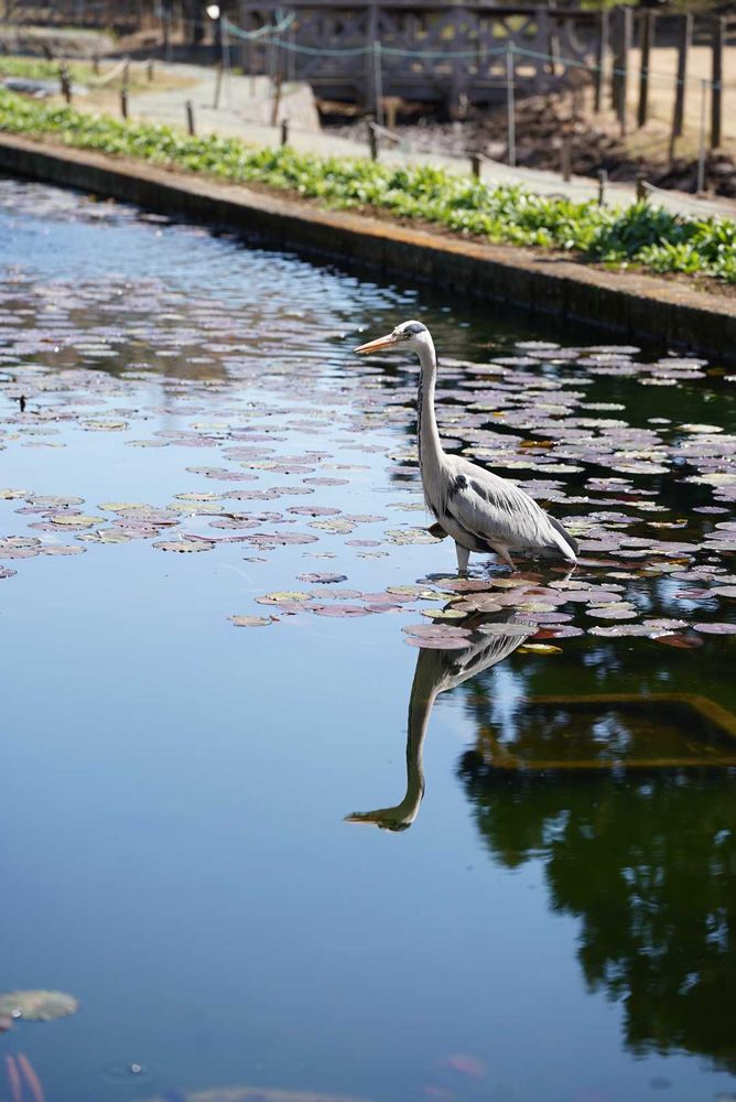 ⑤睡蓮池に舞い降りたアオサギ