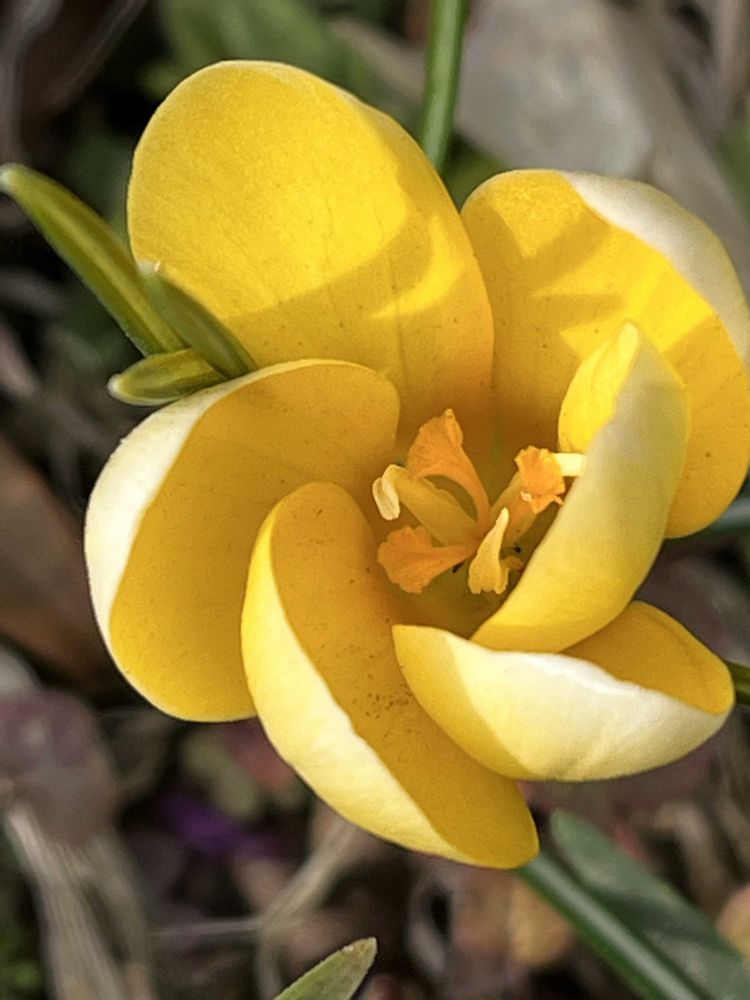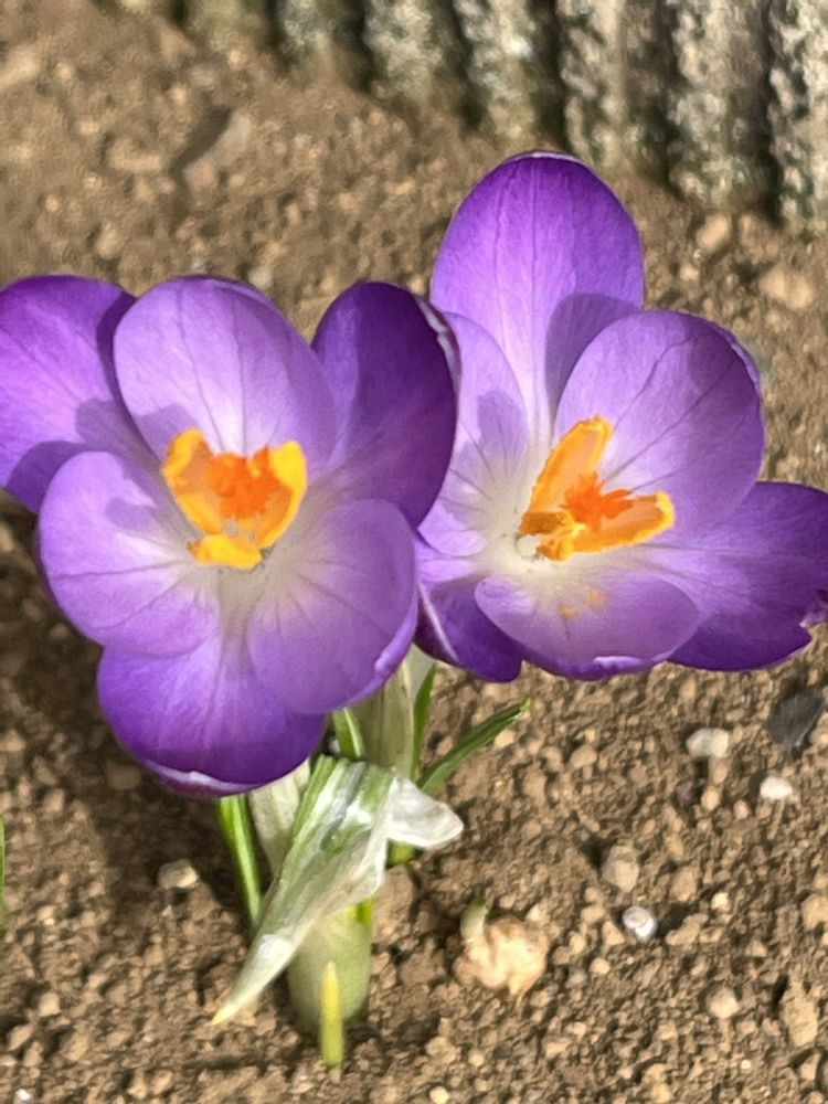 クロッカスの紫と黄色いお花、地面からちょこんと…可愛いです。