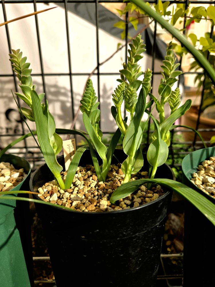ミクロスティグマ、気温が上がって下の方から花芽が現れ始めました 年末から花茎を見守って、ようやく開花ですよ😅