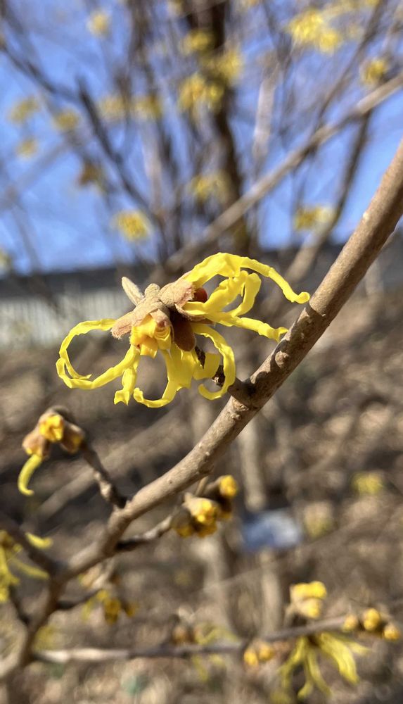 お疲れ様です!不思議な形の花、マンサク。細長い花が錦糸卵みたいに見えてしまいました😅
