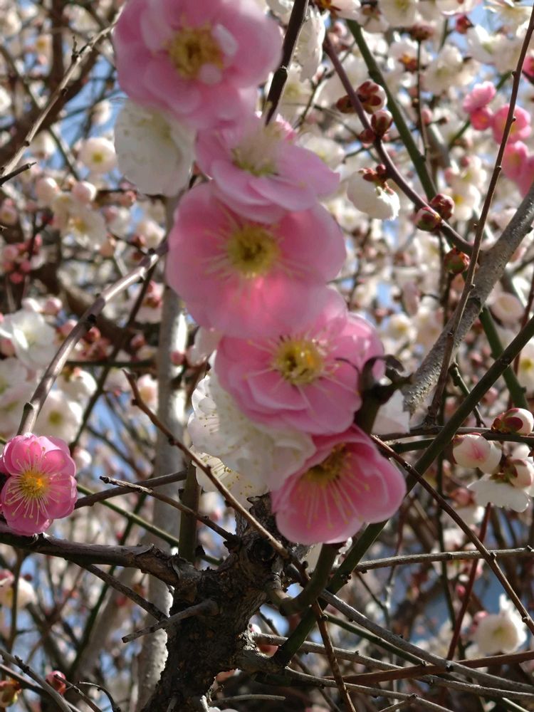 花園中央公園にウメの花が一本の木から白とピンク二色咲いてました