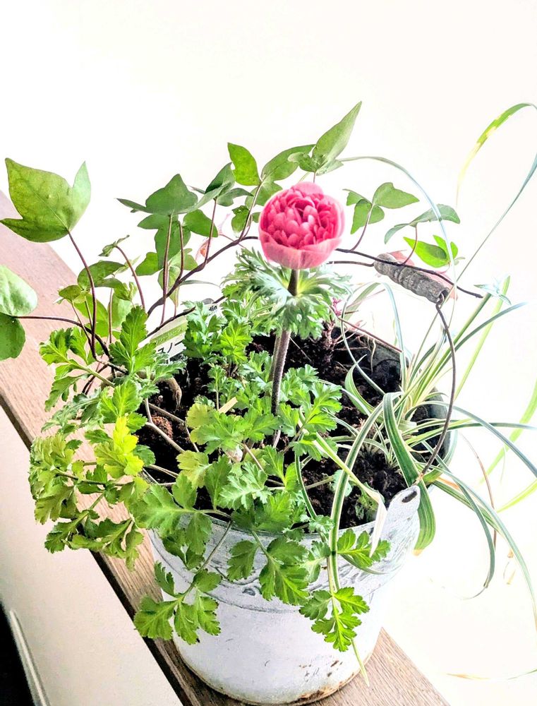 リュウノヒゲの鉢に、この前買ったアネモネを寄せ植えしたよ