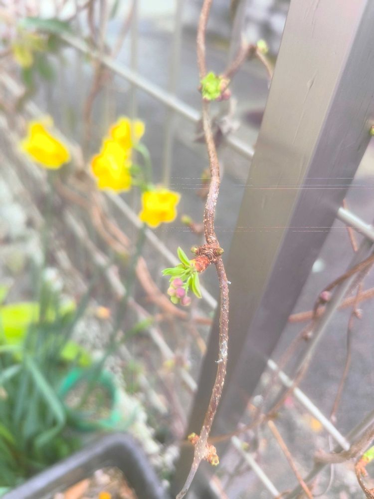 アケビの花がもう咲き出した♪まだ2月なのに汗かく位の暑さの日が続いてたせいだろうね〜。