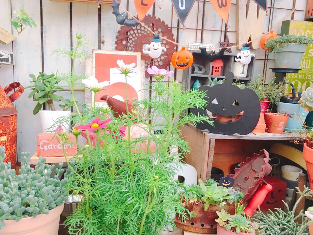 コスモス越しに、ハロウィン🎃グッズが季節を感じて、いいですねっ♪──
