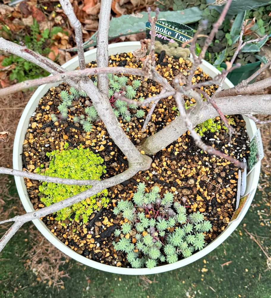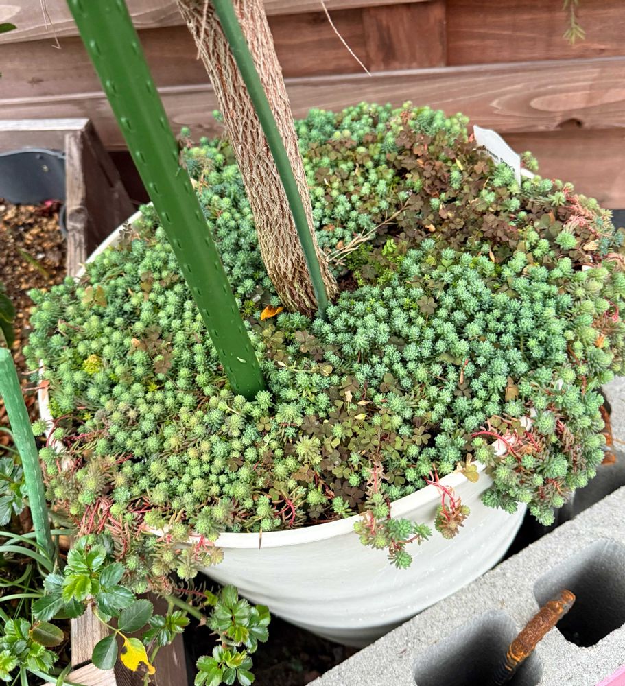 樹木系の鉢の株元に雑草対策にならないかなー、とセダムやセンペルをポイポイしてます。