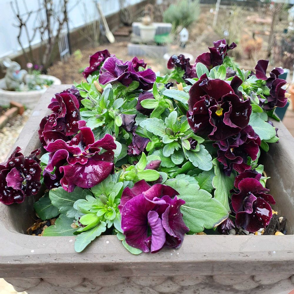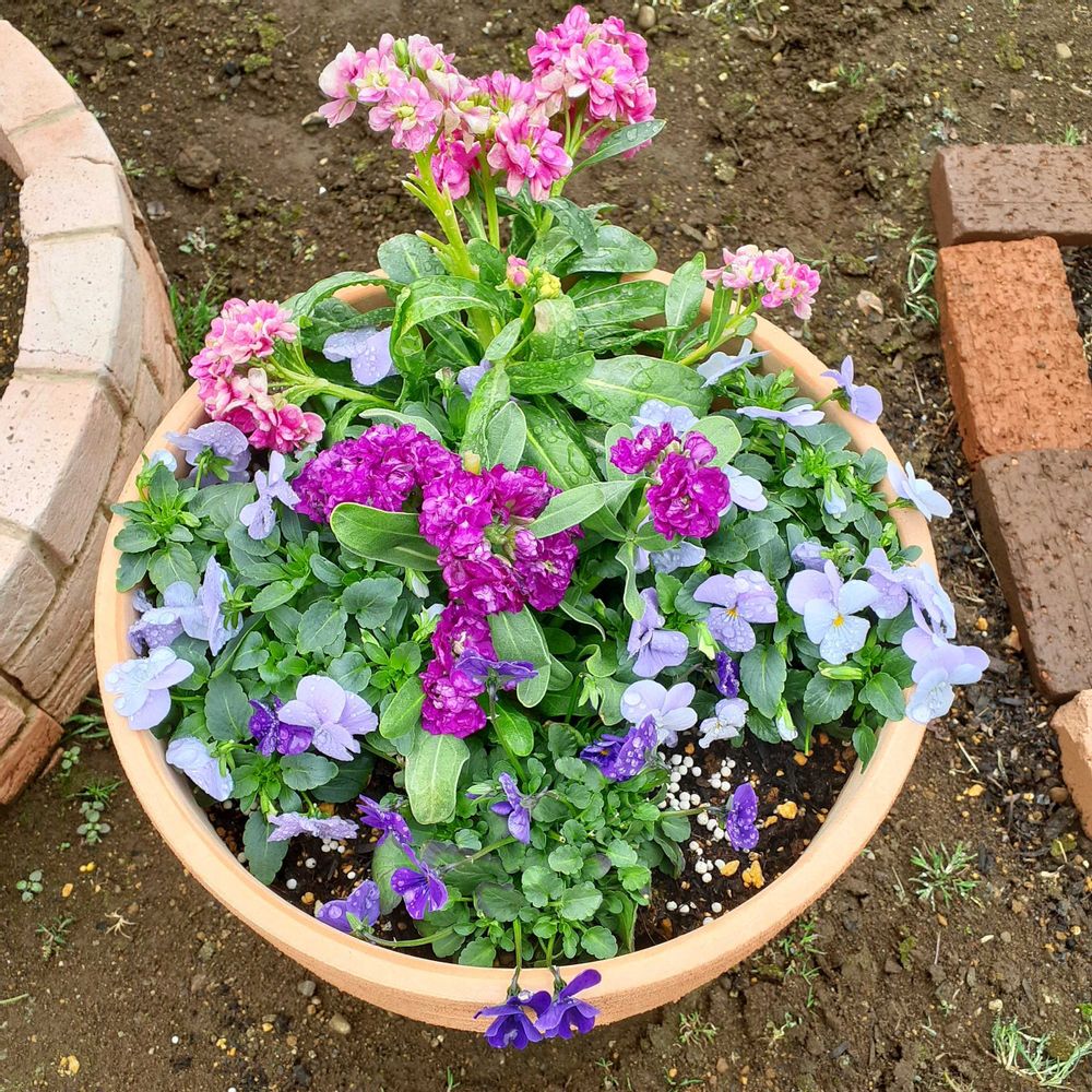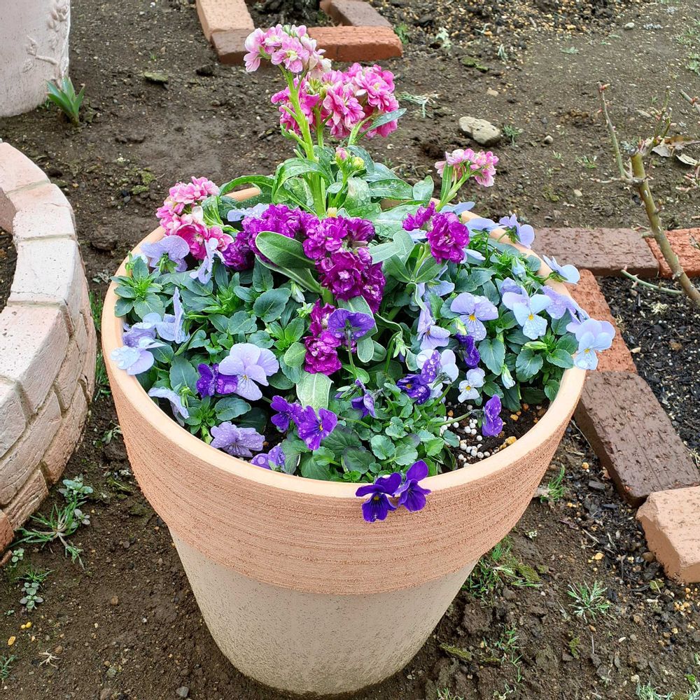 ①②先月作ったストックとビオラの寄せ植え🌻