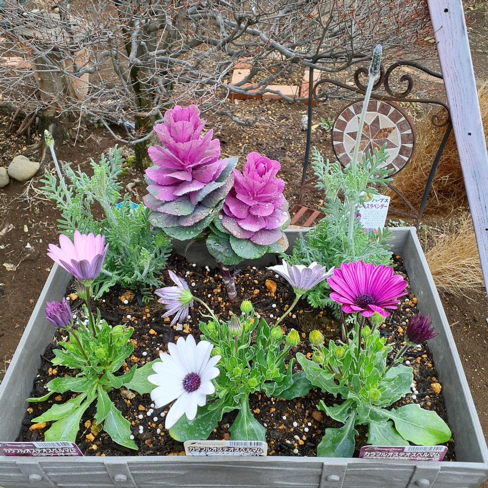 ③最近作ったオステオスペルマム、レースラベンダー、葉牡丹の寄せ植え💞この鉢は葉牡丹の寄せ植えでしたが大きくなってきたので葉牡丹は一つだけ残して地植えにしました🎵踊り葉牡丹にしてみたいけど難しそう🤔