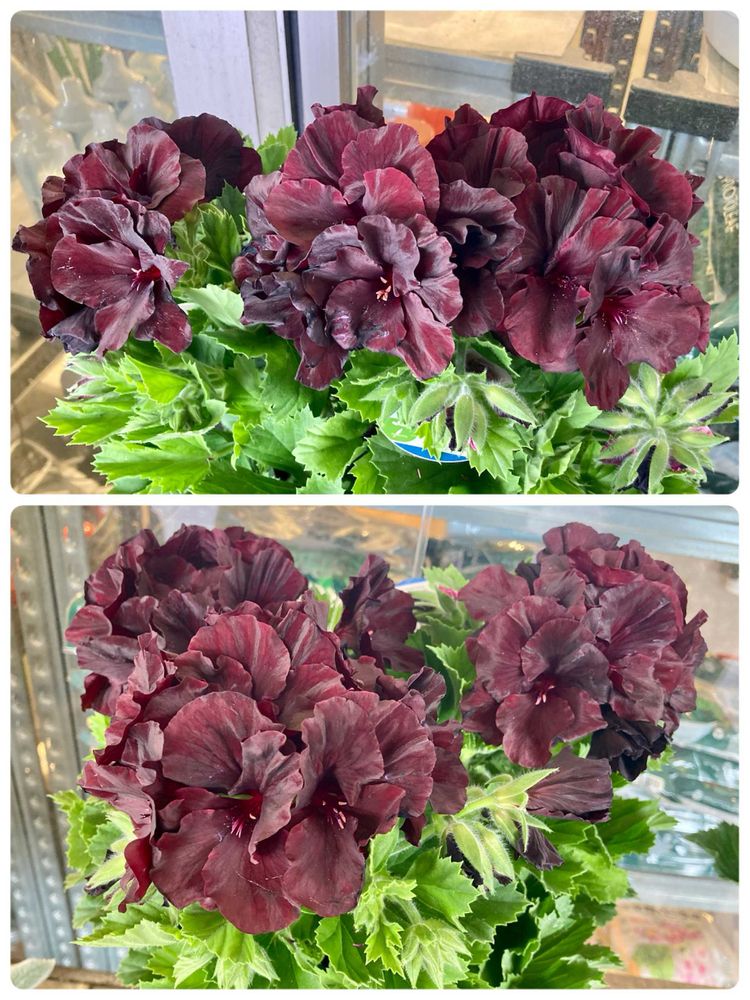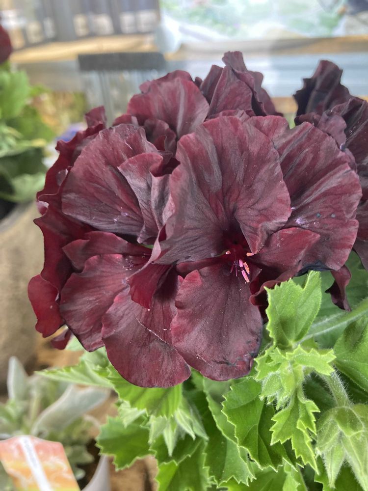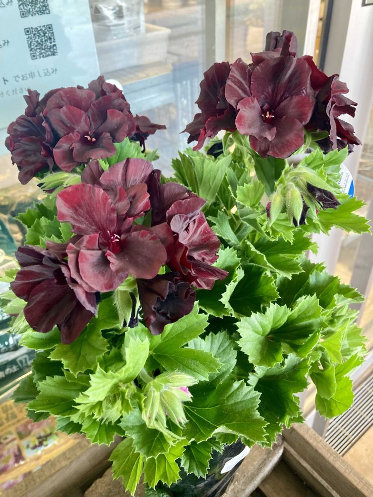 高級感のある上品でシックな花色の「ペラルゴニウム アリストブラック ベルベット」。 花屋の店先に並んでいた。