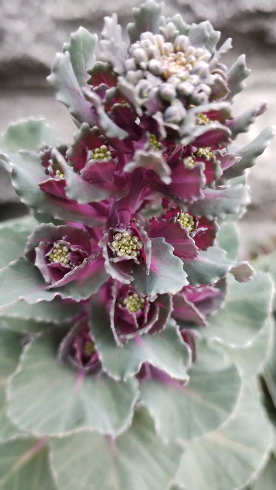 毎回大根くれる友人に焼酎漬け持って行き水菜貰って帰る時に庭の葉牡丹綺麗に新芽出たのパチリ!