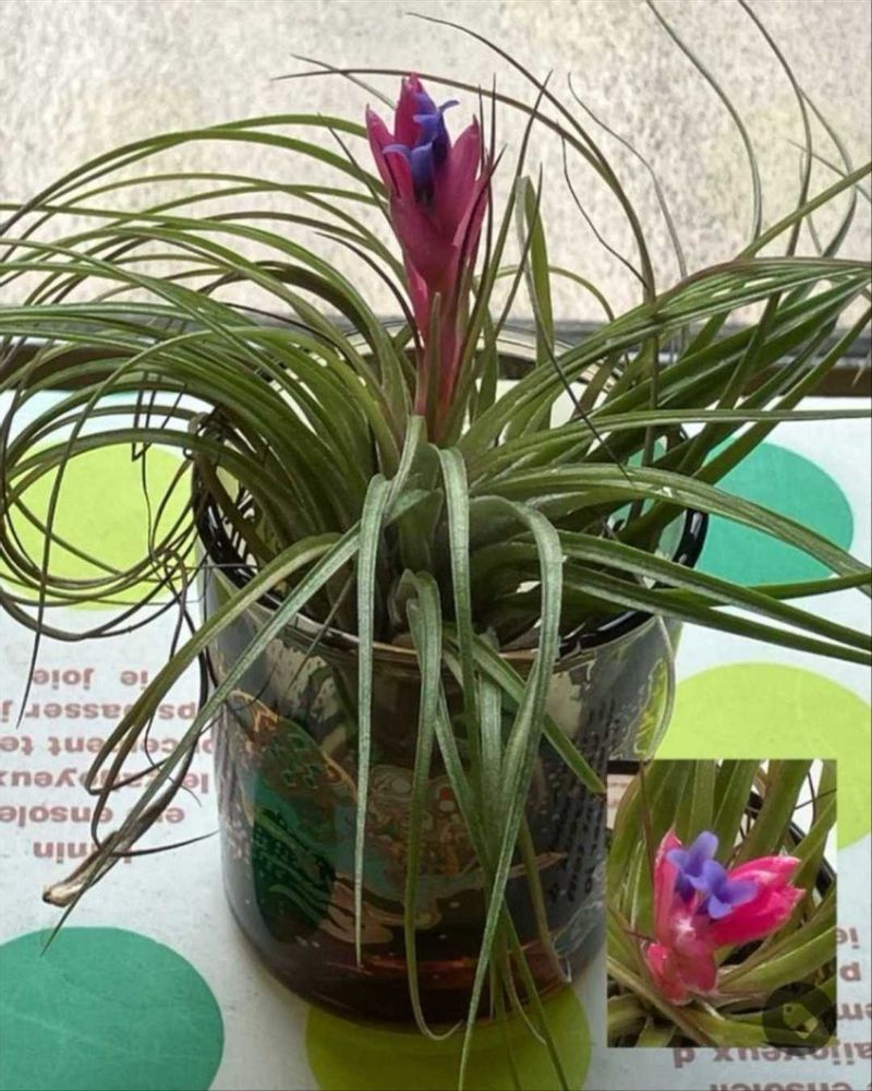 土が無くても空気中の水分や雨を葉から吸収して育ち,ピンク🩷色の苞から紫💜色の花を咲かせるのが特徴‼️でも、日本の環境では適切な水💦やり(霧吹き)が必要だそうです😊