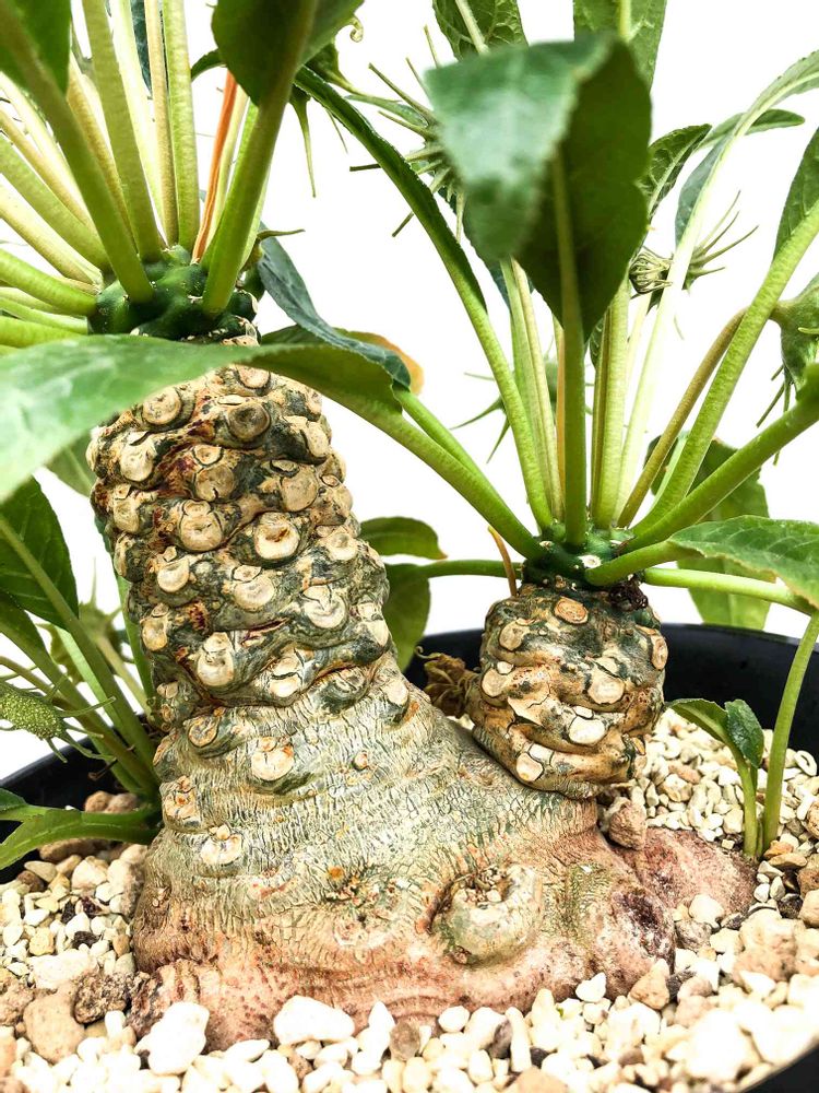 特大のドルステニアフォエチダ。やや深植え気味なのか地中からも新芽が伸びてきてるので、春にもう少し塊根部を露出させてあげたいやつ。花が咲き乱れているので、種が飛んでいたるところにドルステニアが発芽しそう😱
