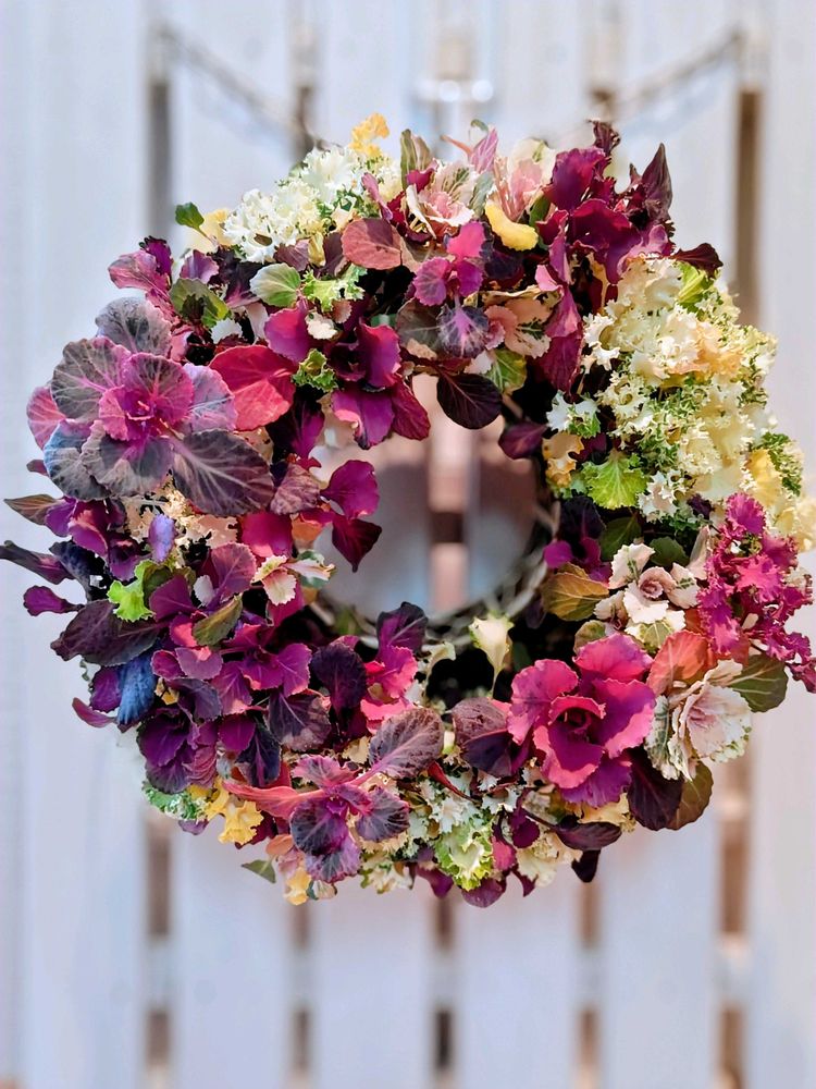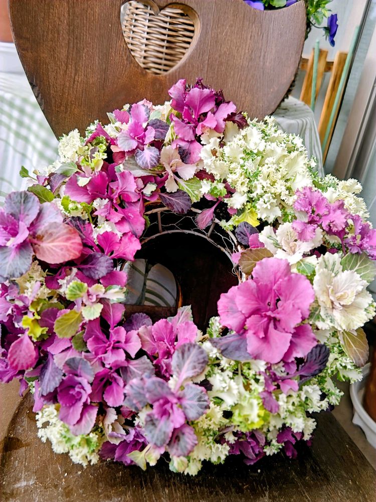 直蒔き葉牡丹リースの今。今がいちばん色の綺麗な時でしょうか。白い葉牡丹の白がハッキリ✨。