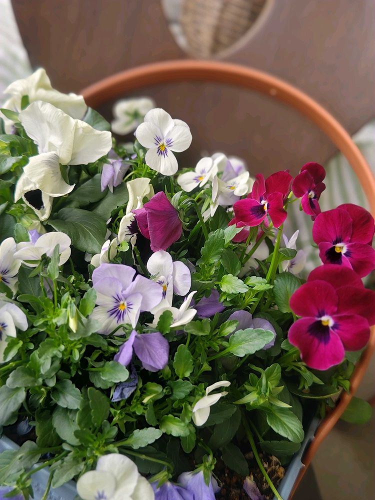 パンジーやビオラが花盛り。小さかった赤系のビオラも咲き始めました✨。