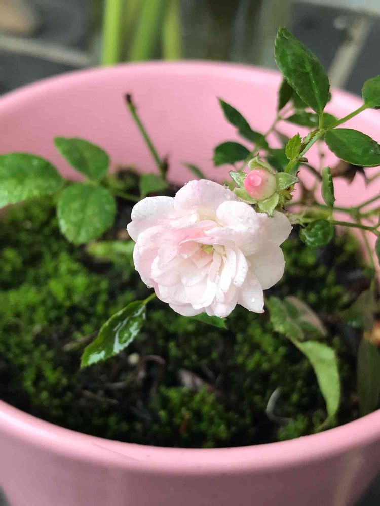ピンク色のバラとピンクの鉢がとても素敵です。
