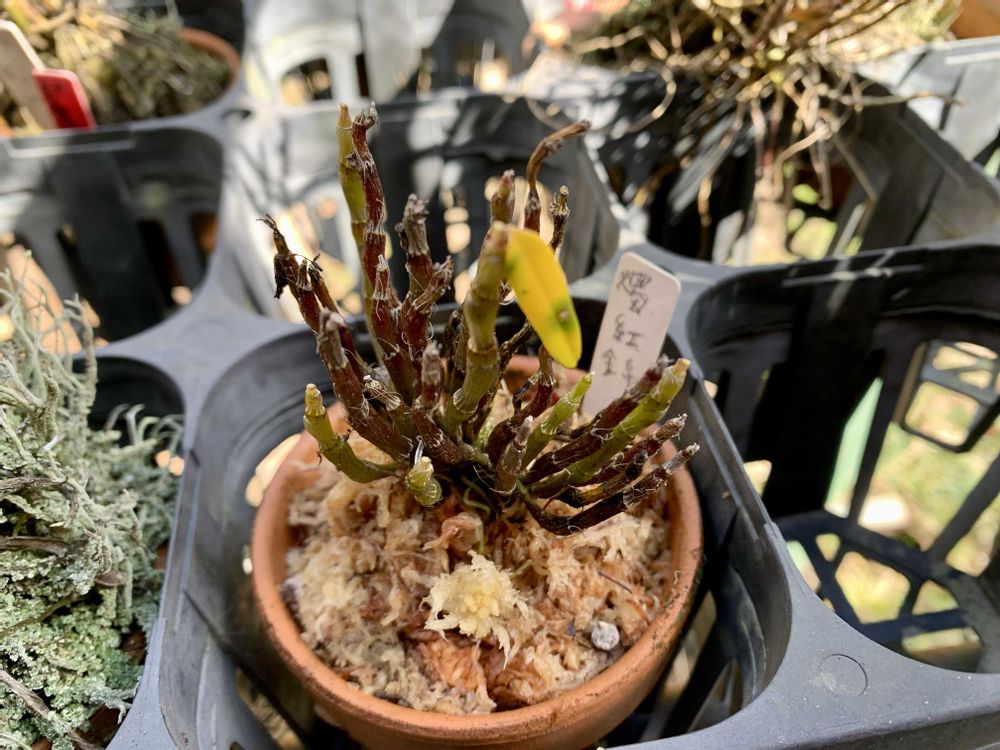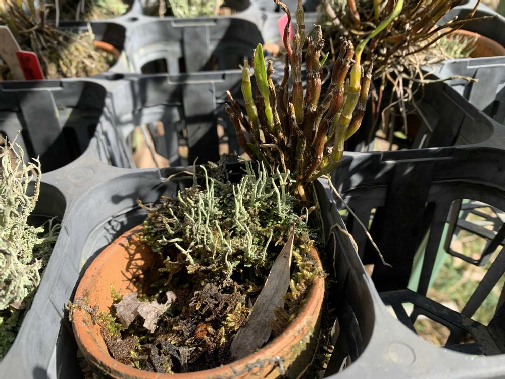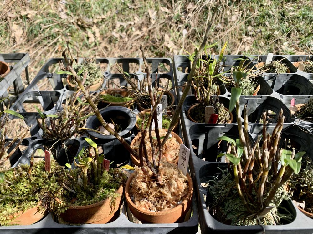セッコク(貴婦人)のもうひとつ砂植えだったのも、またミズゴケで植え直しました😅まだまだいっぱいあるけど、鉢から脱走してるヤツ😱を植え替え💦鉢の中にラベルが残ってました😀燭紅錦さんでした😅家の裏の雪で潰れてたワサビが伸びてきました😀