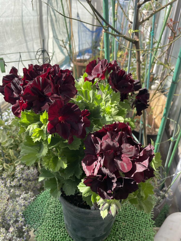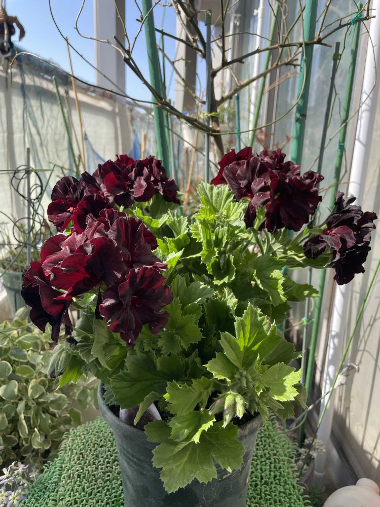 3/1 ペラルゴニウム アリスト ブラック・ベルベット仲間入り😍漆黒の赤に一目惚れ💓初夏まで咲くって✌️蕾もいっぱい🥰