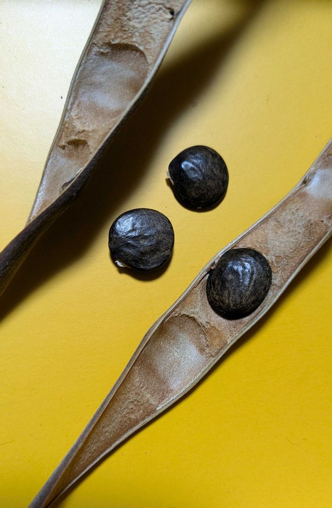 鞘がたくさんぶら下がっている🟤地面には弾けた殻がいくつも転がっている🟫