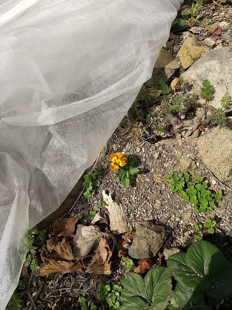 ここは冬越しの不織布シートを被せた所。なんか色付いてると見えてめくってみると…、可愛いパンジー!嬉しいね😊