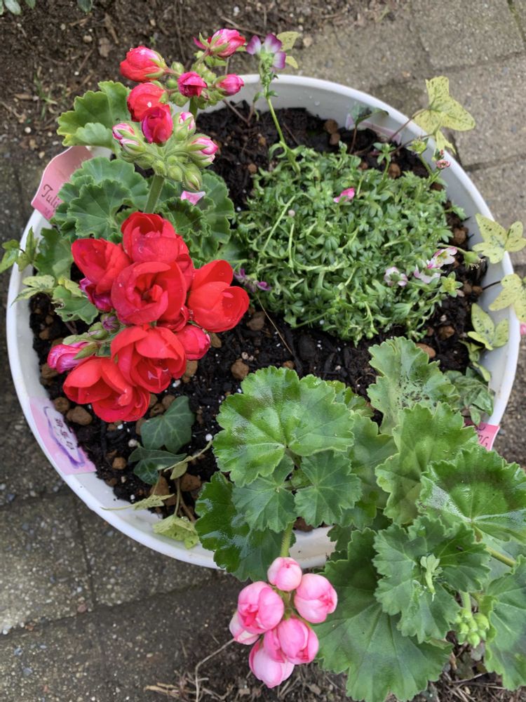 一枚目、今年初の寄植え作ってみました❣️チューリップ咲ゼラニウム2色、クモマグサ、アイビー白雪姫