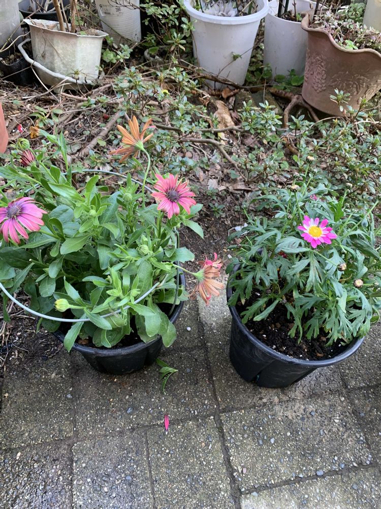 二枚目、見切り品でゲットしていたマーガレットとオステオスペルマムをスリット鉢に植え替えました
