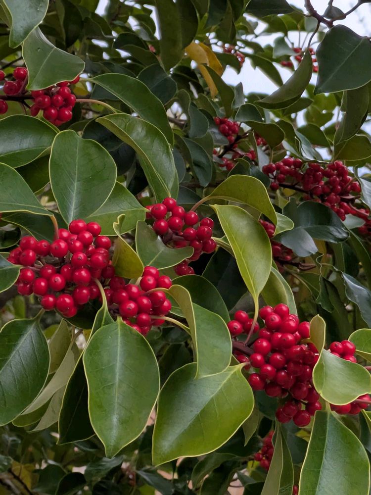 真っ赤な小さな実と光沢のある緑の葉が