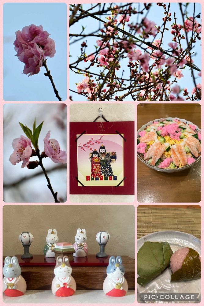 ①桃の花と雛飾り、ちらし寿司、桜餅と柏餅も😋