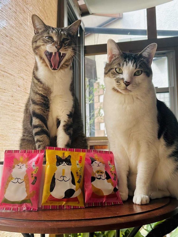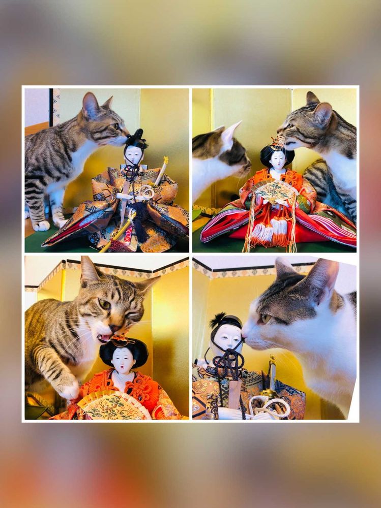 にゃんこ様のあくび?顔がチャーミング😆雛人形、持っていませんが飾ったら絶対グチャグチャにされると思います💦
