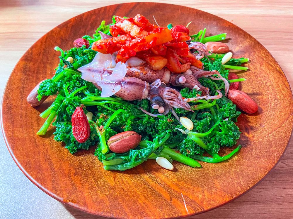 お迎えしたデトックス氣巡り浄血野草さんたちは同じく氣巡り水巡り血のチャージを得意とする春の救世主パセリさんと一緒にザッと茹でて絞って 血のチャージの得意なホタルイカさんを載せて晩御飯のおかずに