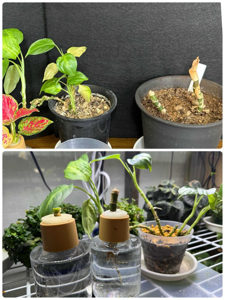 ③ディフェンバキアは葉が残っているのは小さな鉢に植え替え、茎だけのは元気な所まで切り戻し、アグラオネマの水挿しを利用してます🎶