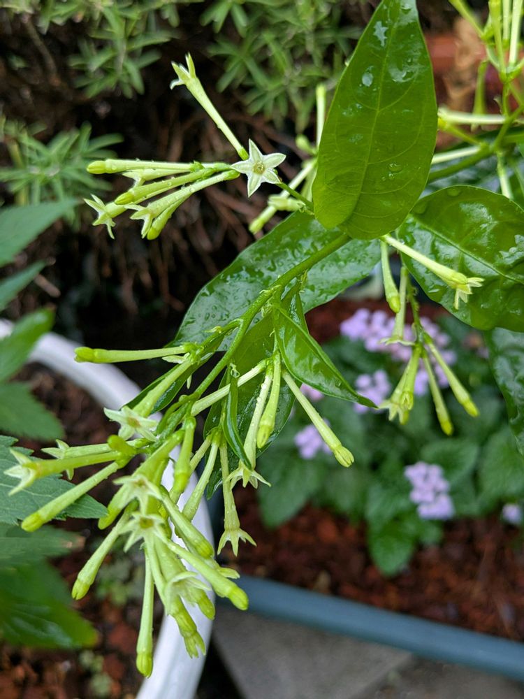 『夜になると緑白色の星型の花が強く甘い香りを放つのが特徴で、寒さに弱いため冬は室内管理が推奨され、日当たりを好み、剪定に強く、初心者でも育てやすい植物』みたいです☺️