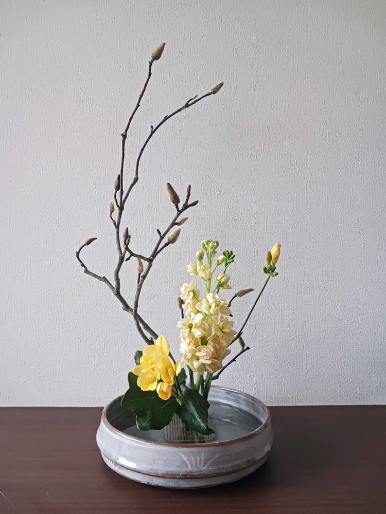 早春のイエローを添えて鼠志野水盤に生けてみました。